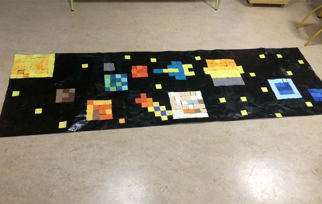 La banderole pixélisée de notre équipe française de CP/CE1 a été sélectionnée par l’ESA parmi les gagnants et gagnantes du défi « Mission pixel art ». Paxi, la mascotte de l’ESA, a même souhaité les féliciter personnellement : « Waouh ! J’ai hâte de l’accrocher dans mon vaisseau spatial ! »