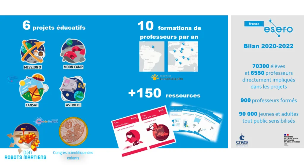 Since 2020, CNES has been coordinating ESA’s ESERO educational program in France, with the help of its partners La FondationLa main à la pâte, Cité de l’espace, and Planète sciences, and the support of the French Ministry of Education and Youth.