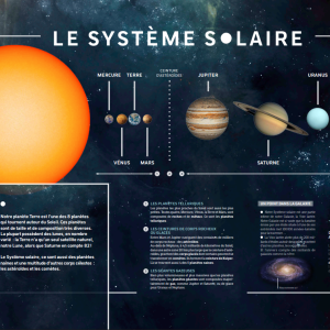Découvrez une série de 12 panneaux d’exposition présentant les différentes planètes et autres corps de notre Système solaire ainsi qu'une série de 4 panneaux complémentaires apportant des informations plus scientifiques et techniques sur quelques missions spatiales
